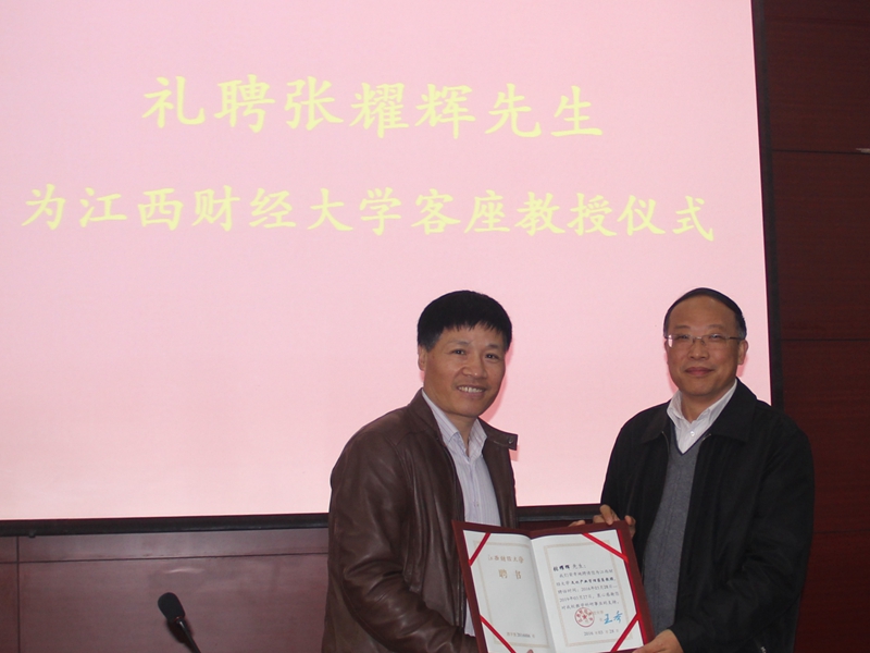 3月30日下午,杰出校友张耀辉先生被礼聘为我校文化产业管理专业客座教授,副校长阙善栋为其颁发了聘书。张耀辉先生曾任横店集团有限公司总裁,世界华商大会筹委会委员,哈高科股份有限公司董事长,现任上海明辉股权投资管理有限公司董事长。张先生系我校杰出校友,于1981-1988年,在我校攻读本科和研究生学位;1988-1997年,曾任我校经济学副教授。张先生虽为商人,但对国学兴趣浓厚,且有独到见解,是儒学的现代践行者。曾分别入读于中欧国际工商管理学院和北大国学班,致力于思考和践行从技术、制度、文化三维视野提升企业核心竞争能力。曾出入佛老,最后安顿在儒家,师从北大哲学系杨立华教授。目前是中国哲学史学会名誉理事。